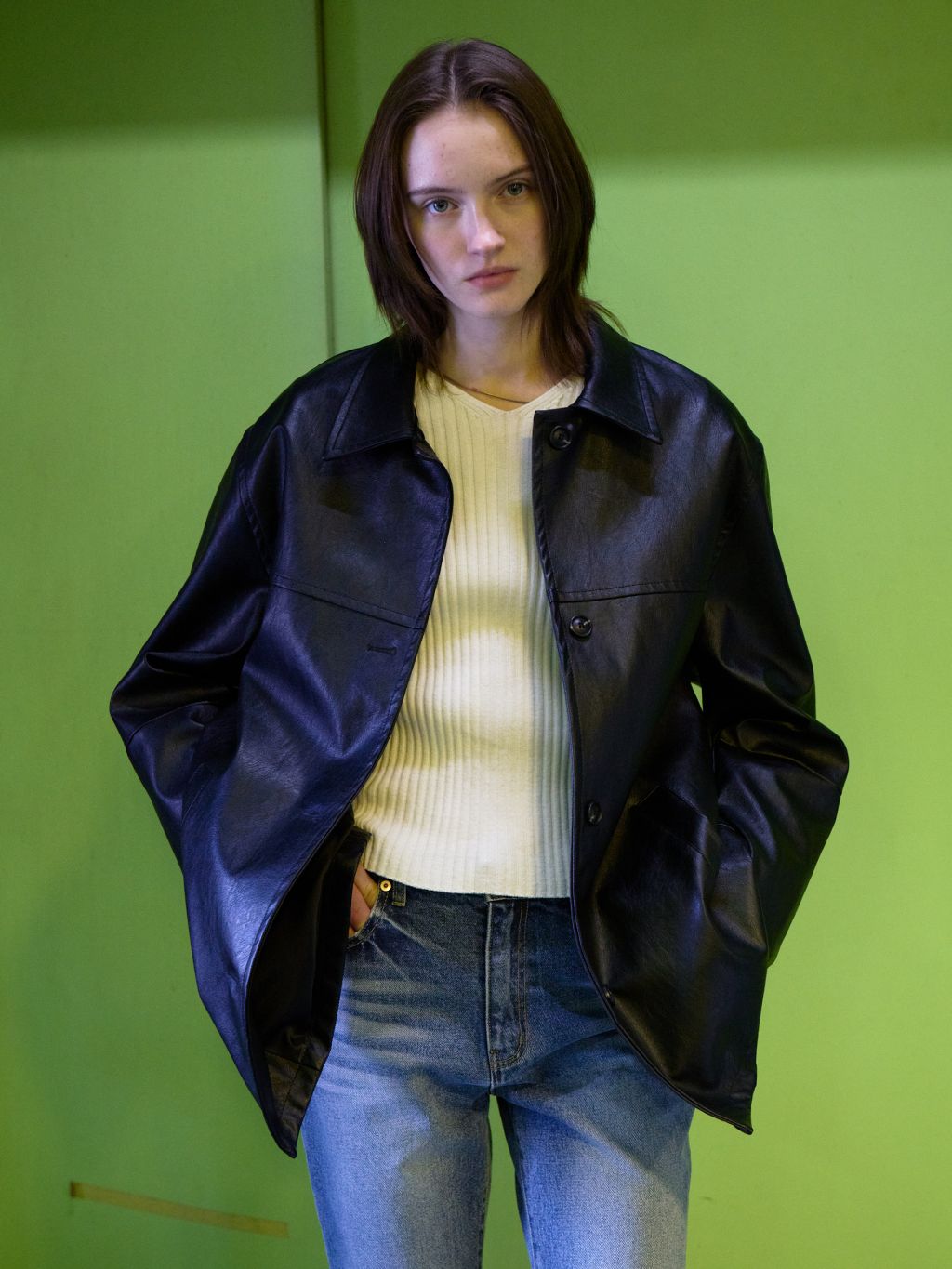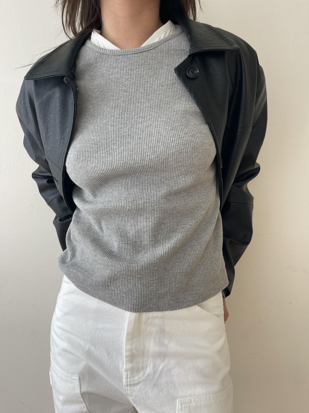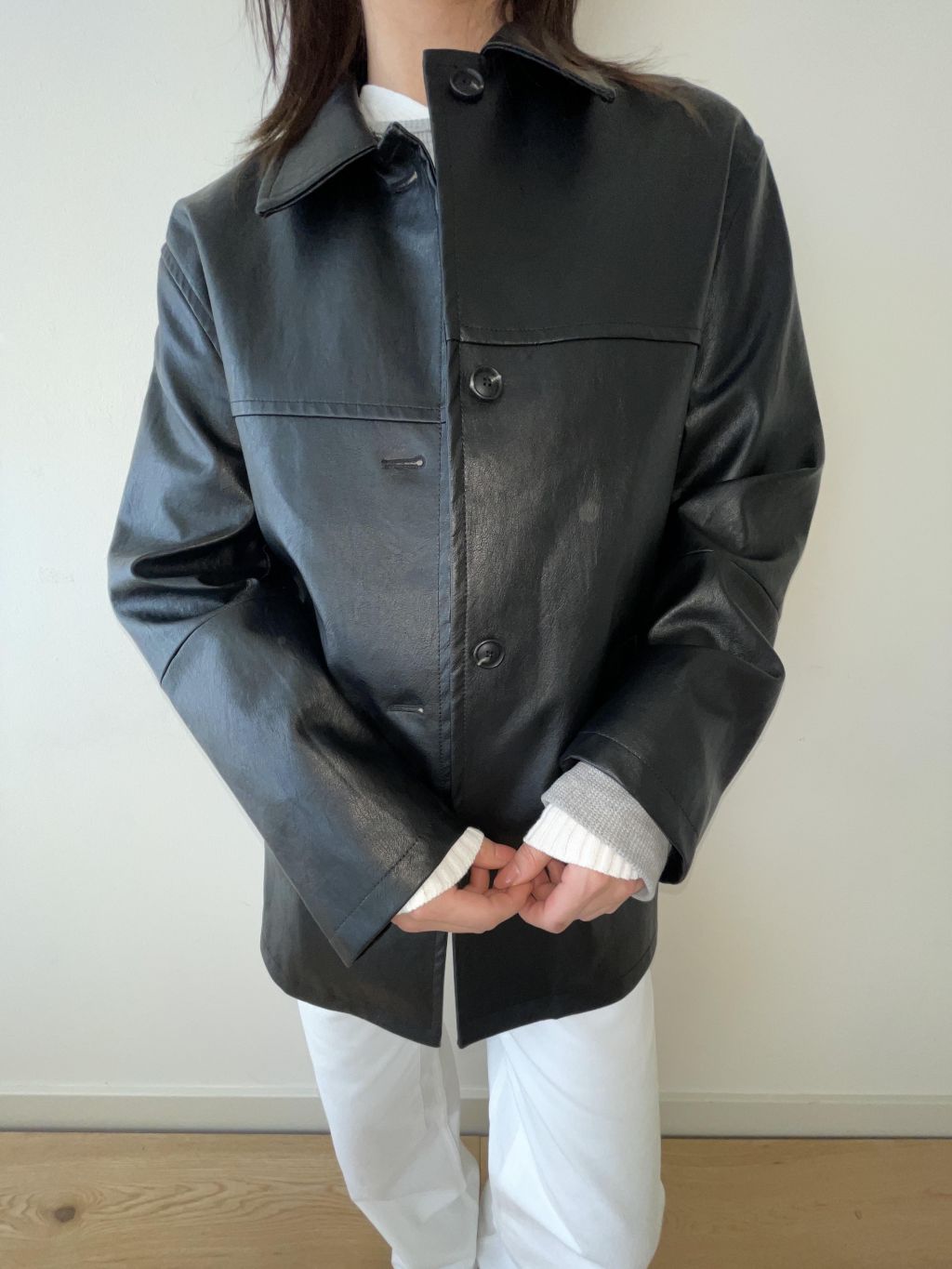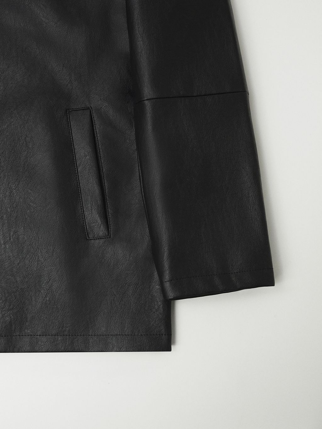 부드러운 터치감과 은은한 광택이 돋보이는 비건 레더 소재로 제작되어 자연스러운 아름다움을 표현합니다. 팔과 가슴에 위치한 스티치 디테일은 활동성을 높이는 동시에 디자인적 요소를 더해줍니다.