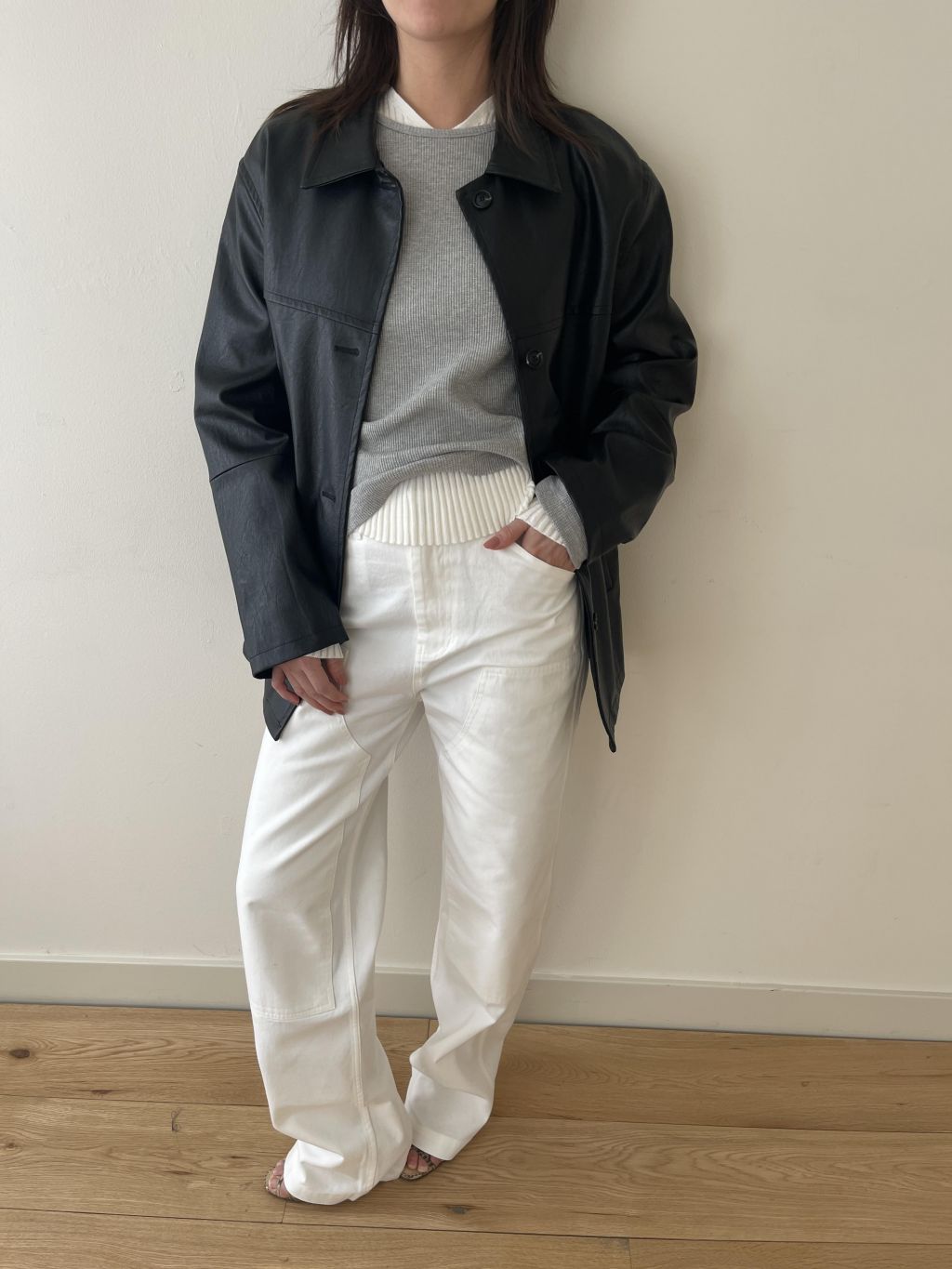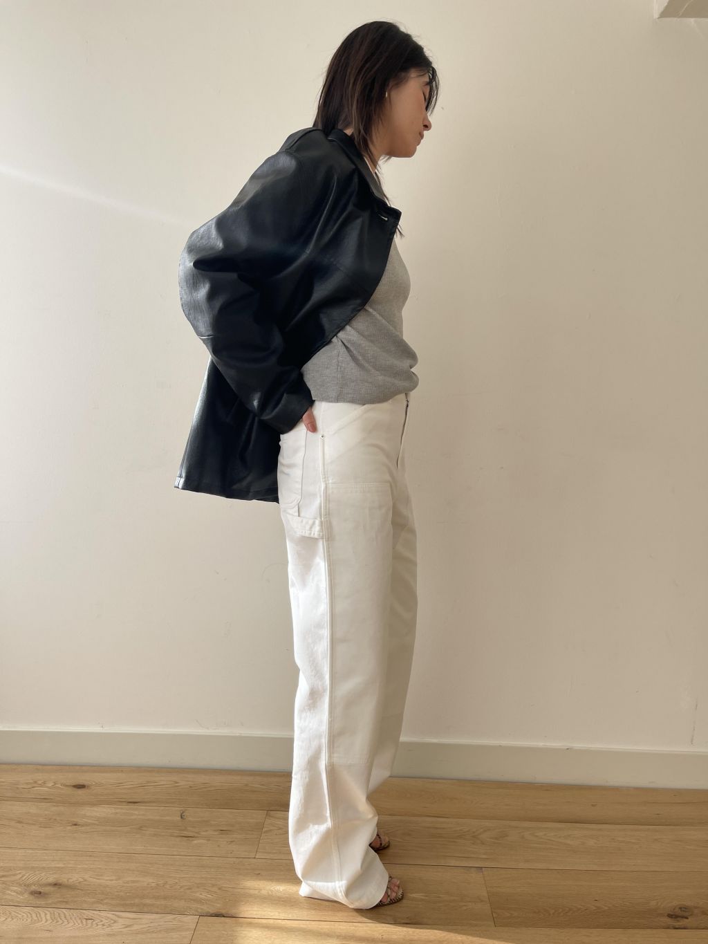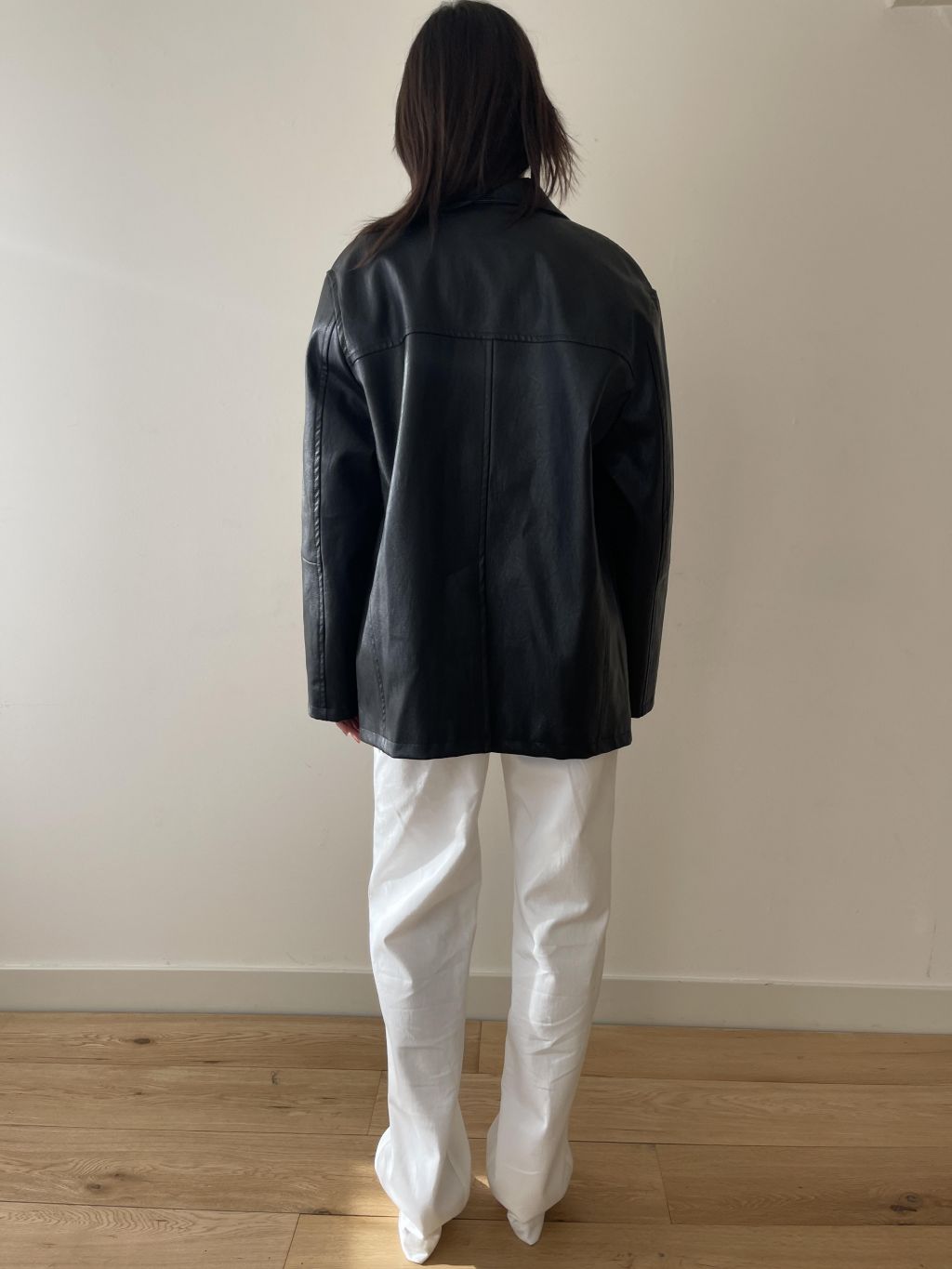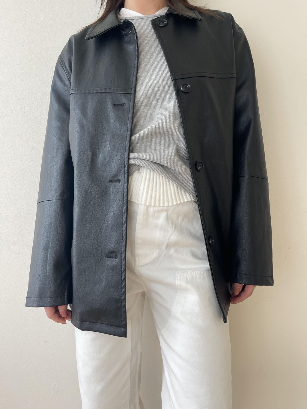 부드러운 터치감과 은은한 광택이 돋보이는 비건 레더 소재로 제작되어 자연스러운 아름다움을 표현합니다. 팔과 가슴에 위치한 스티치 디테일은 활동성을 높이는 동시에 디자인적 요소를 더해줍니다.