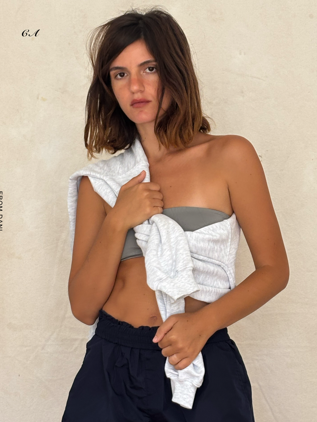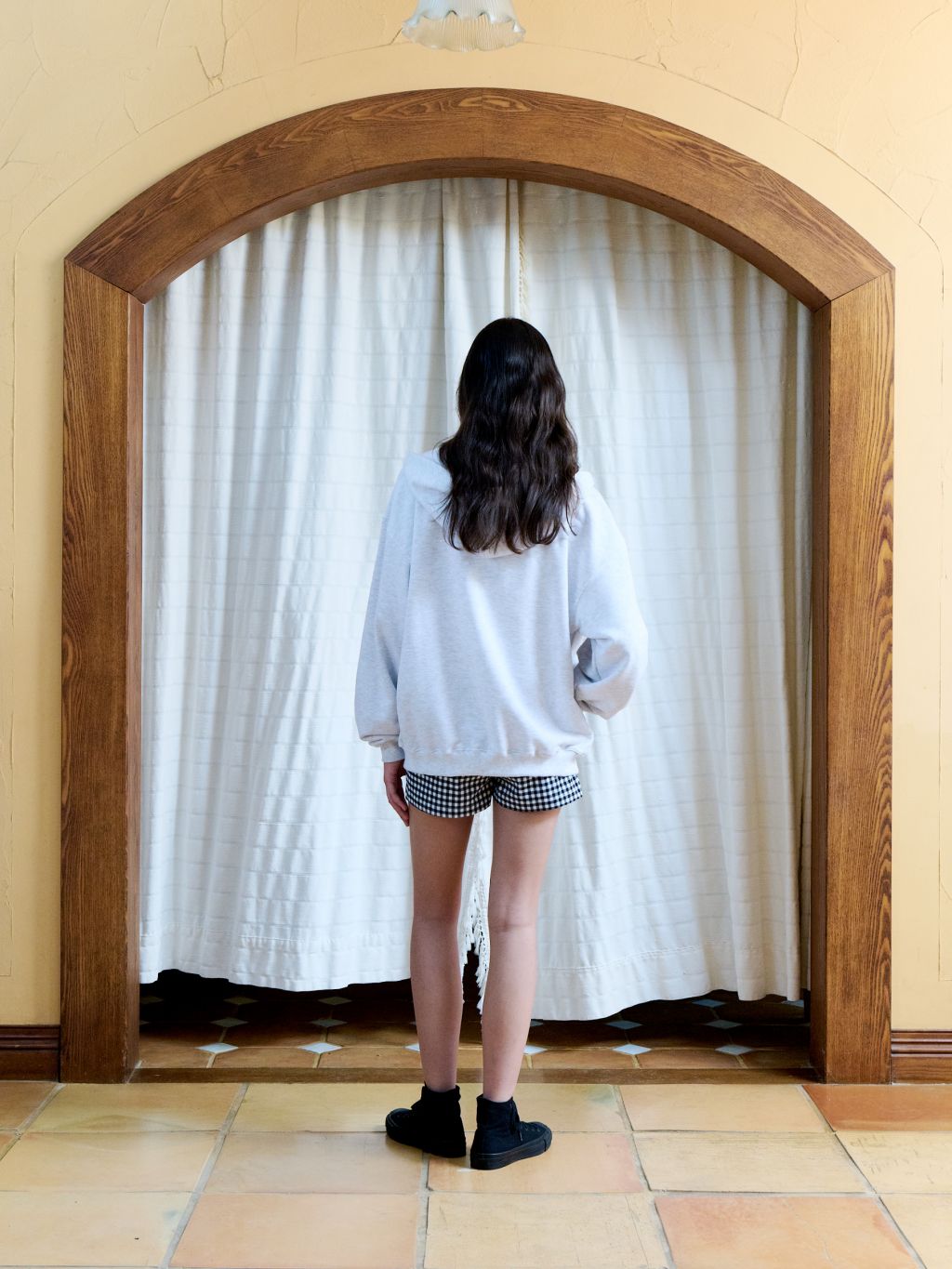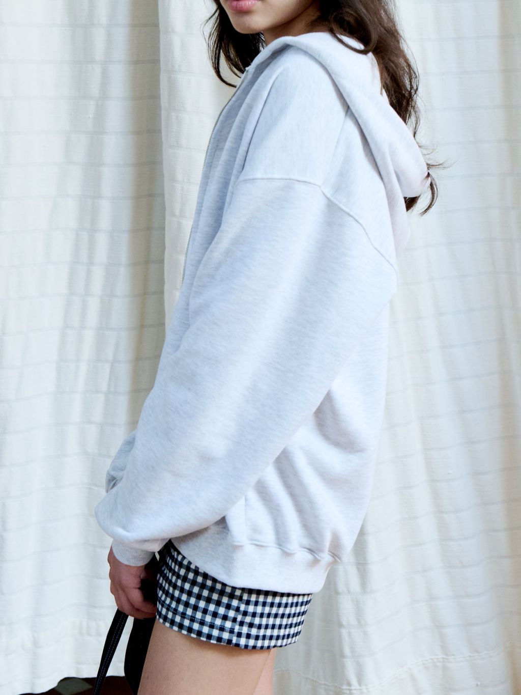 넉넉하게 떨어지는 후드 라인은 어깨 위로 우아하게 드리워지고, 그레이 멜란지 코튼의 부드러움은 맨살 위에 닿는 순간부터 기분 좋은 여유를 선사합니다. 여유롭게 흐르는 가슴 품, 그리고 도시의 리듬을 닮은 적당히 짧은 기장은 입는 이의 실루엣을 한층 쿨하게, 또 여성스럽게 강조해줍니다.