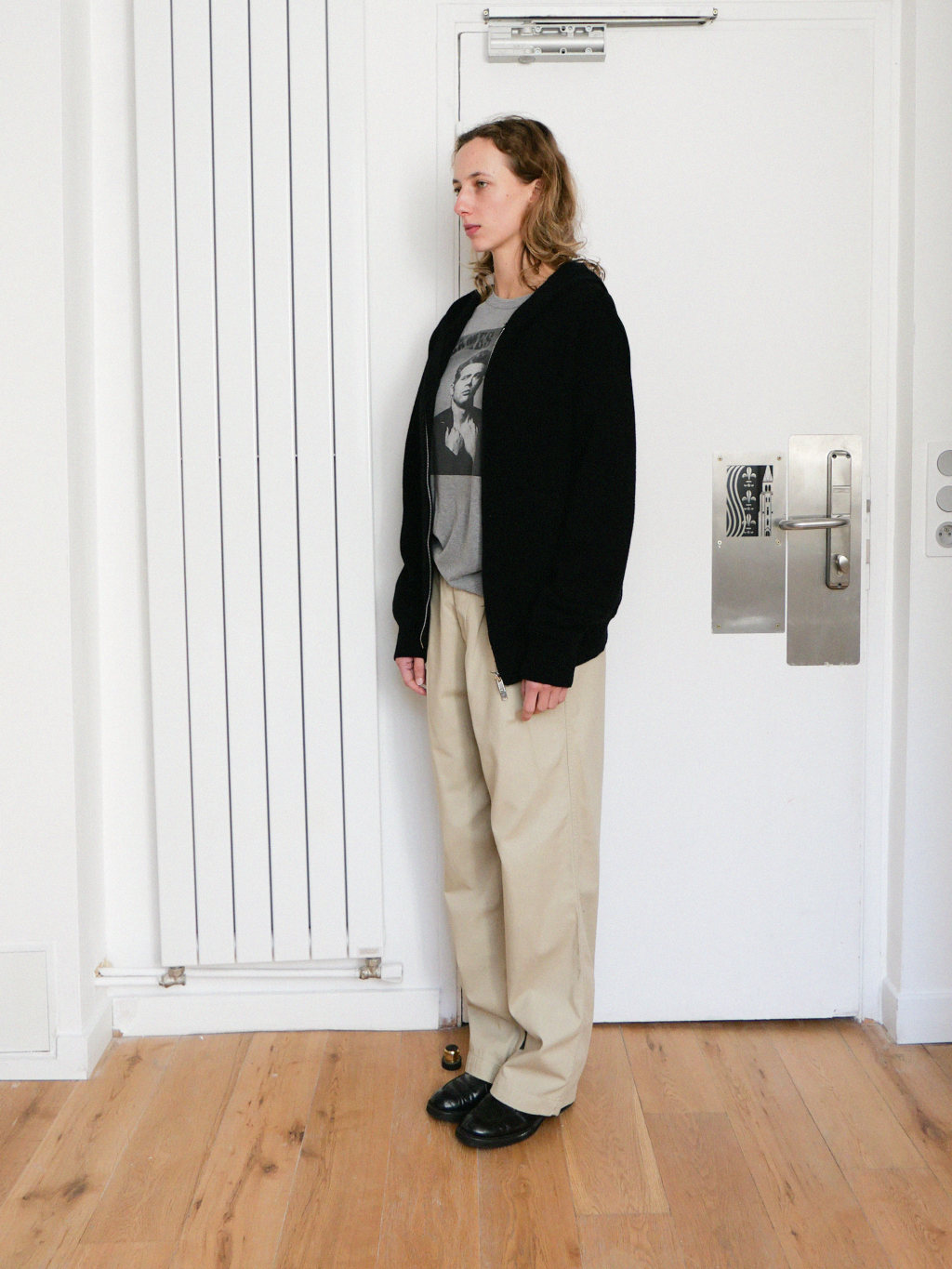 ‘프랭키 후디(FRANKIE HOODIE)’는 1990년대 빈티지 스웻 후디의 여유로운 실루엣을 CADALOGUE의 시선으로 재해석한 니트 후디입니다. 스웻셔츠의 자유롭고 편안한 무드 위에 니트 특유의 질감과 구조적인 완성도를 더해 새로운 균형으로 완성했습니다.