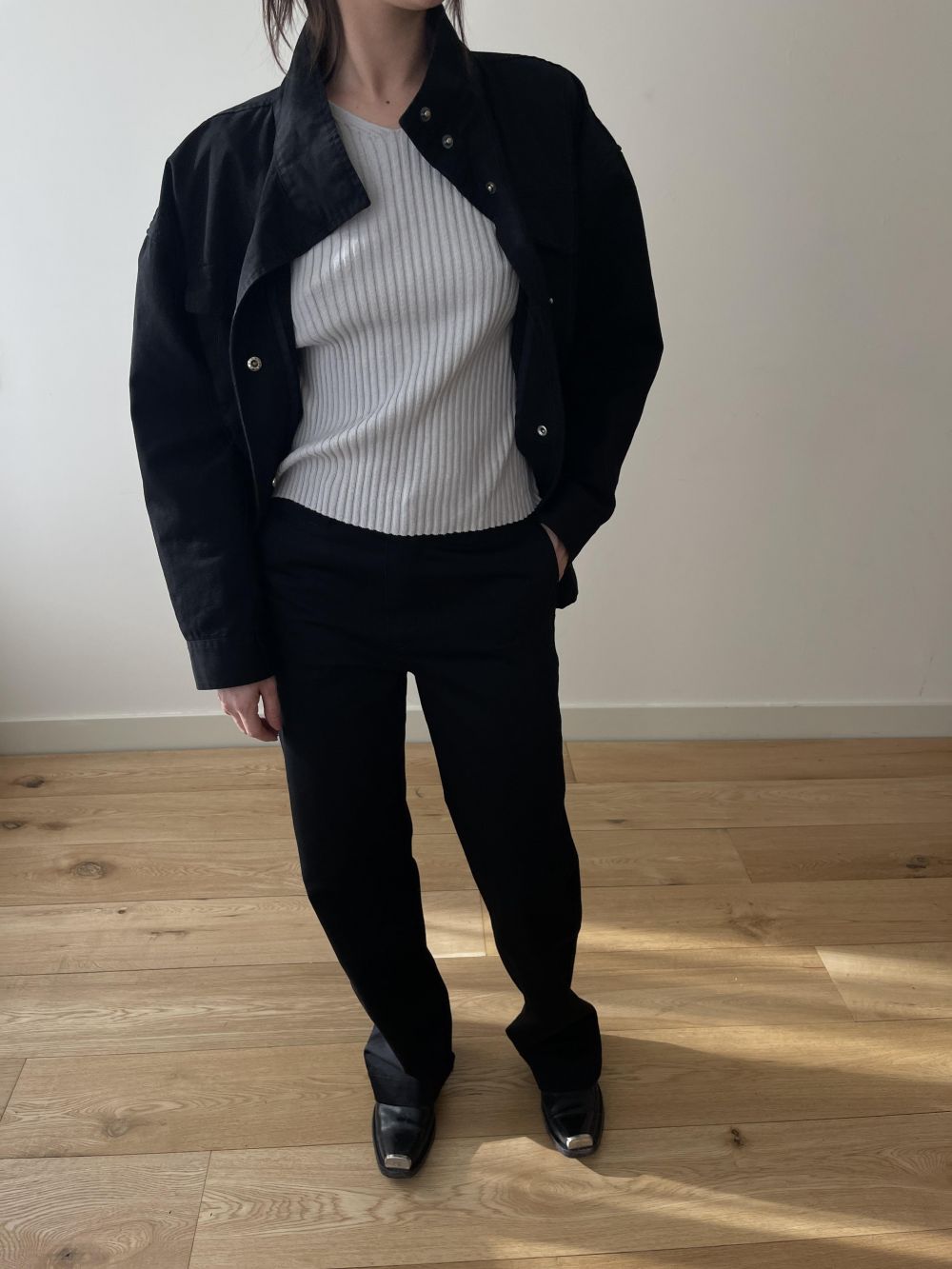 전체적으로 균형 잡힌 라인과 자연스러운 피팅감을 느낄 수 있습니다. 심플한 티셔츠나 셔츠와 매치하면 마린 룩부터 데일리까지 다양한 스타일링이 가능합니다.