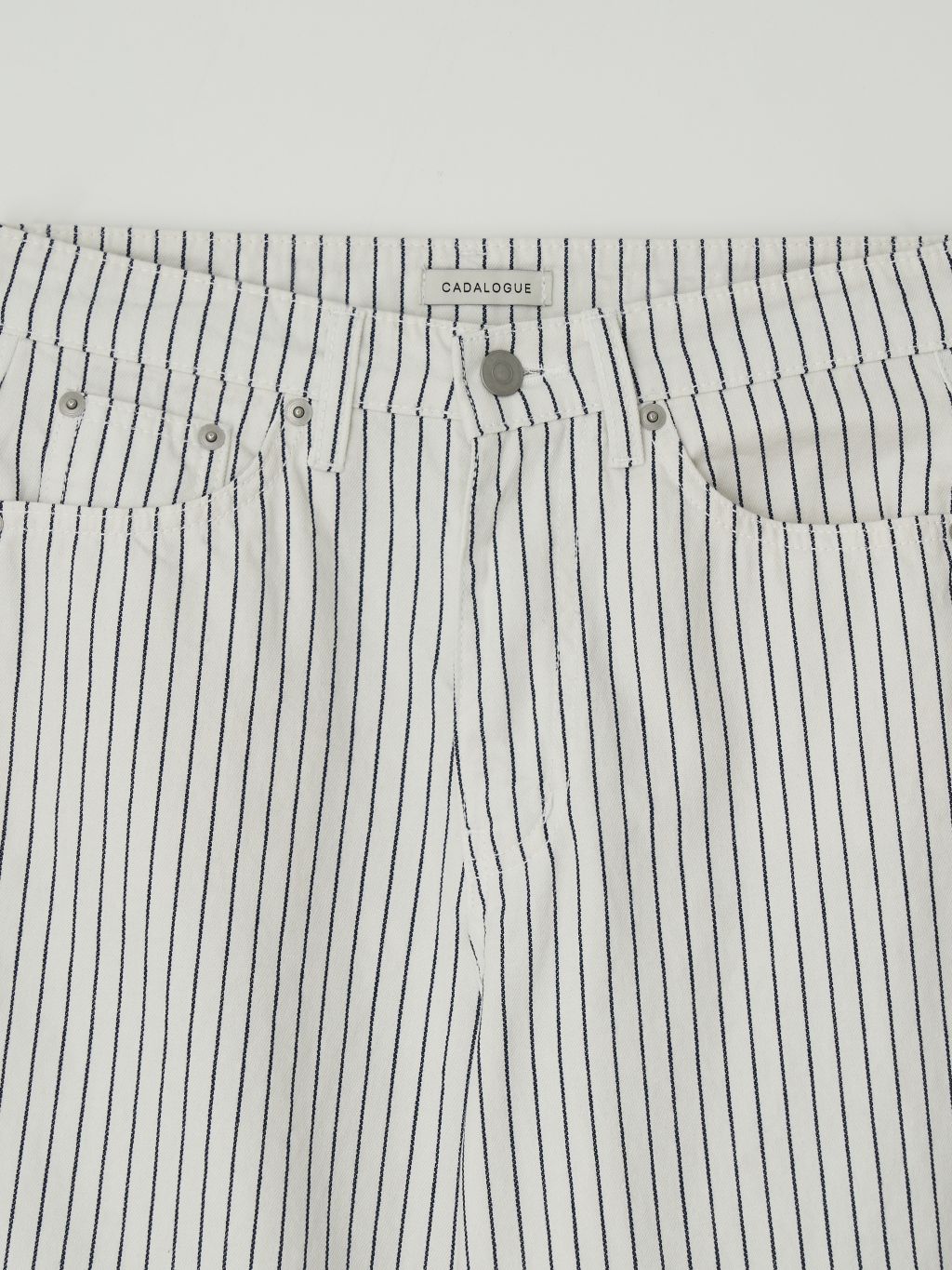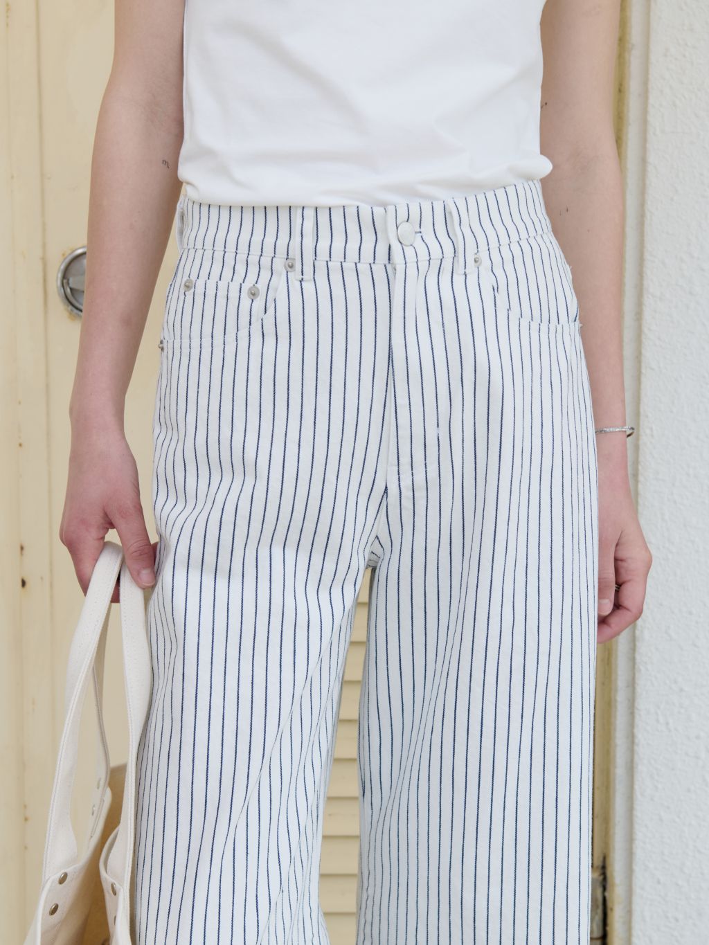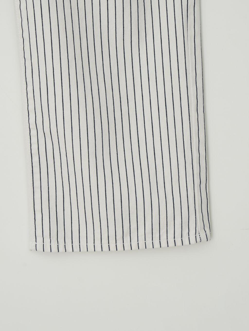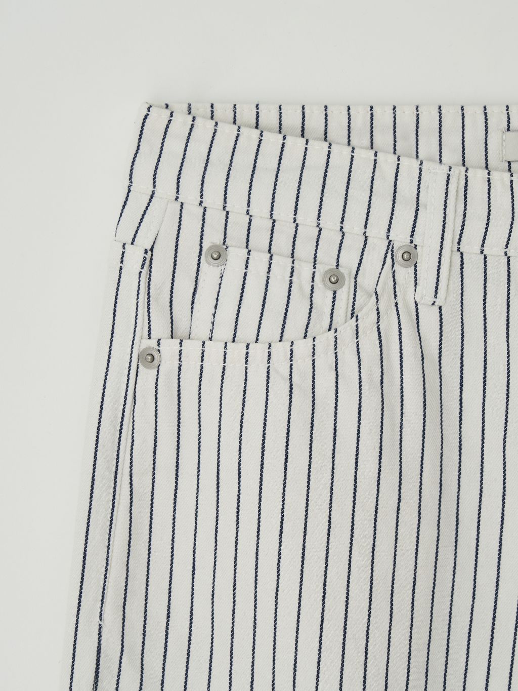 화이트와 네이비의 핀스트라이프 원단을 사용해 한층 경쾌하고 시원한 이미지를 더했습니다. 시각적으로 다리가 길어 보이는 효과와 함께, 여름 시즌에 어울리는 산뜻한 분위기를 연출할 수 있습니다.