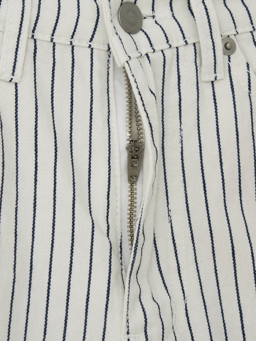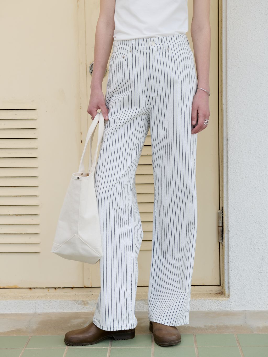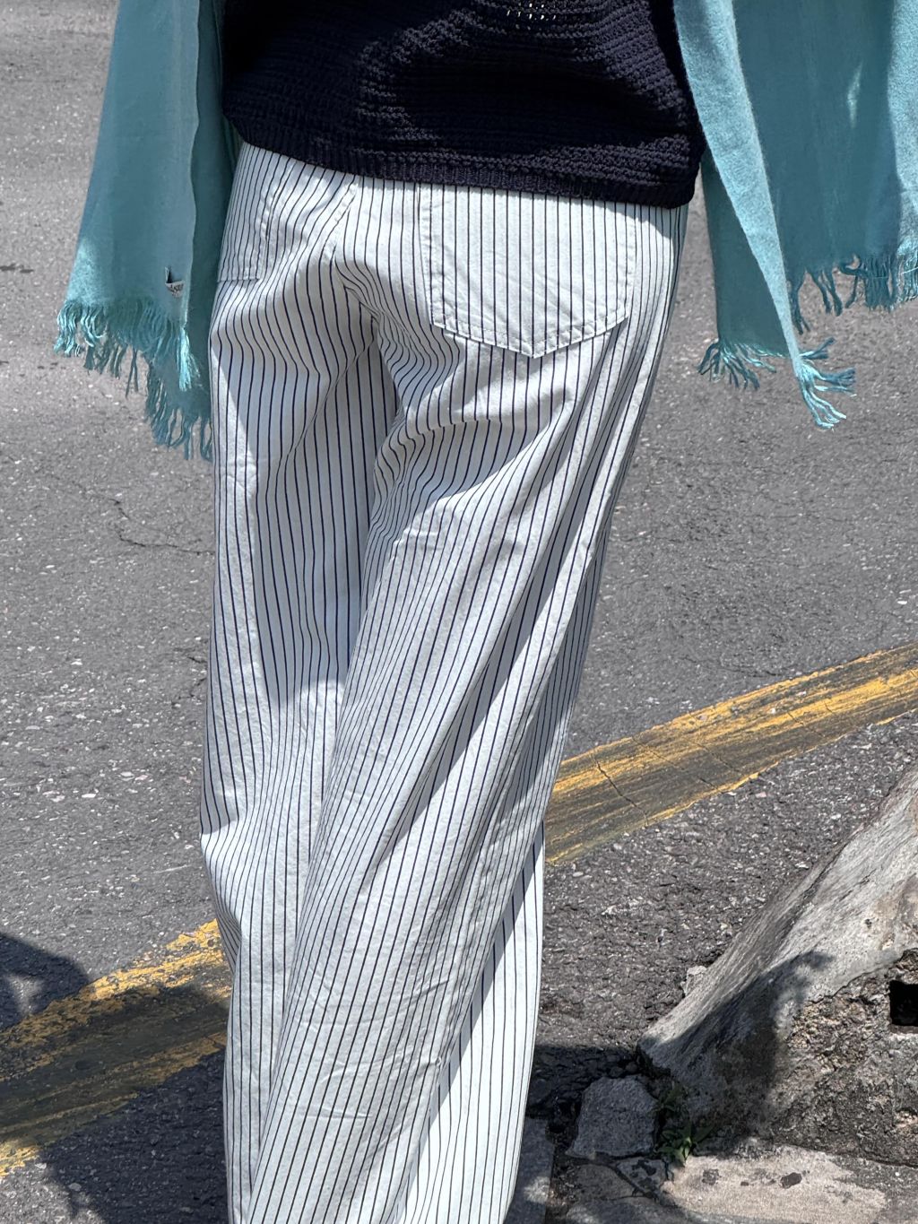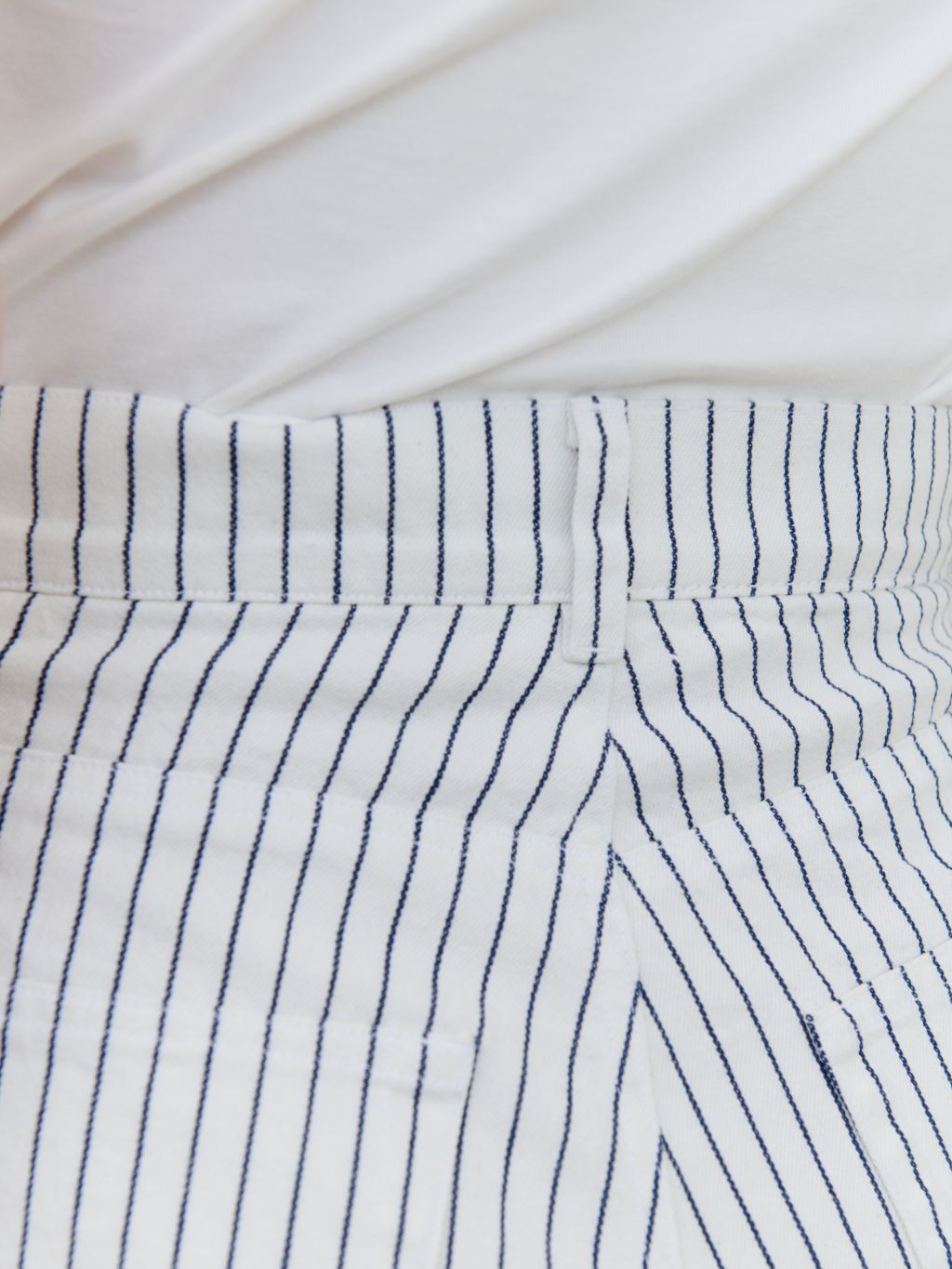화이트와 네이비의 핀스트라이프 원단을 사용해 한층 경쾌하고 시원한 이미지를 더했습니다. 시각적으로 다리가 길어 보이는 효과와 함께, 여름 시즌에 어울리는 산뜻한 분위기를 연출할 수 있습니다.