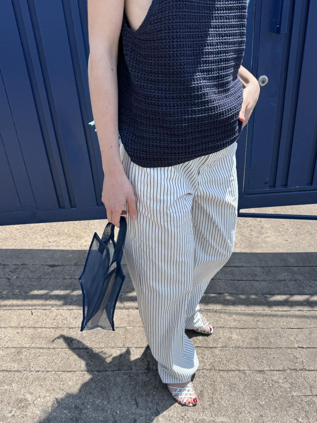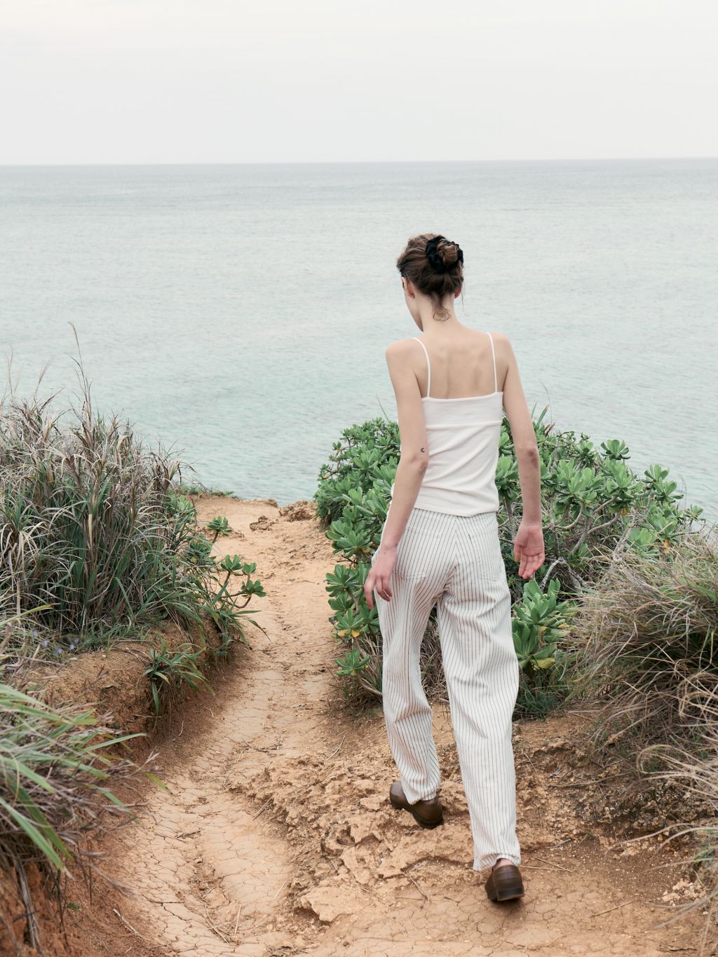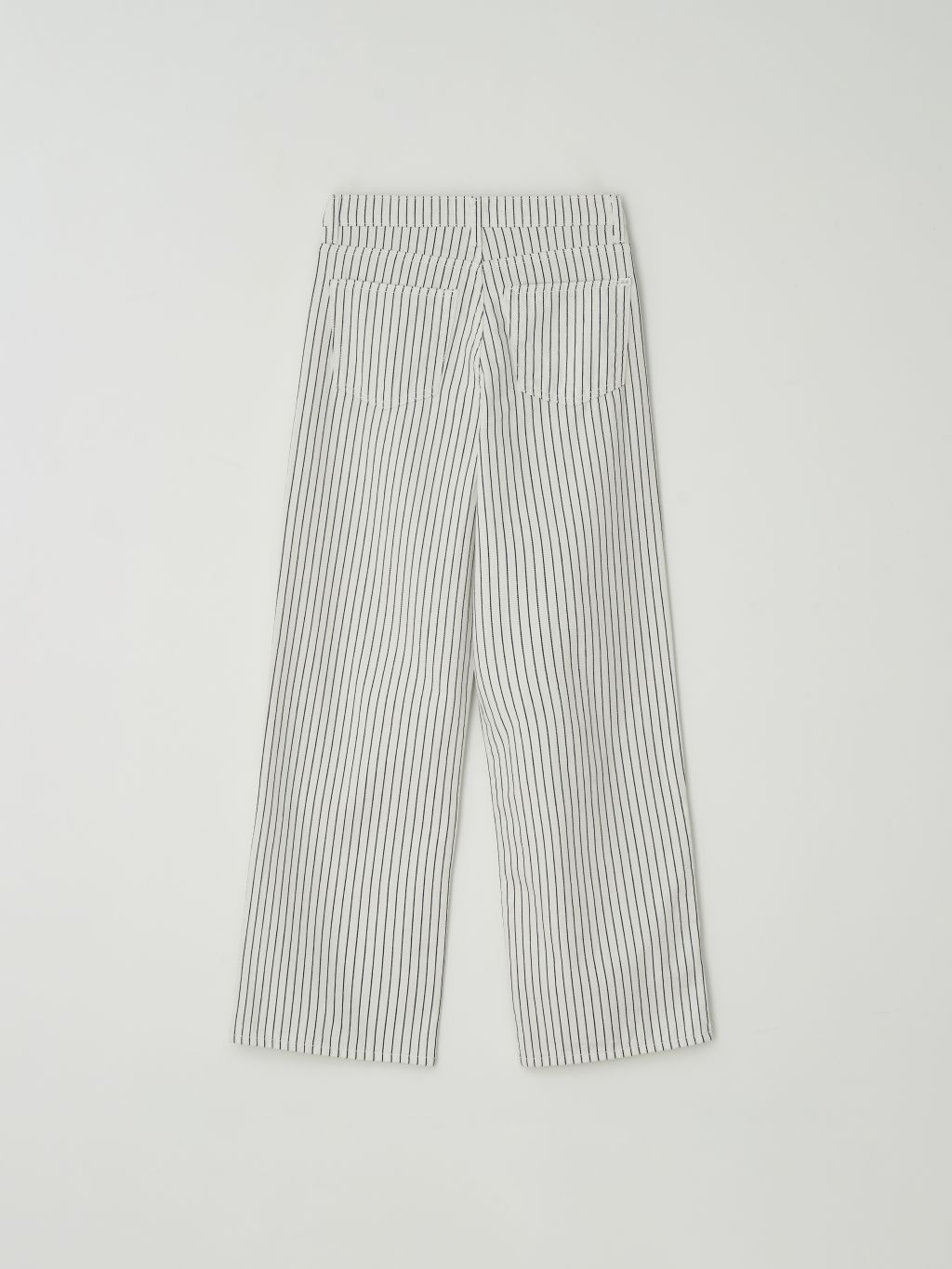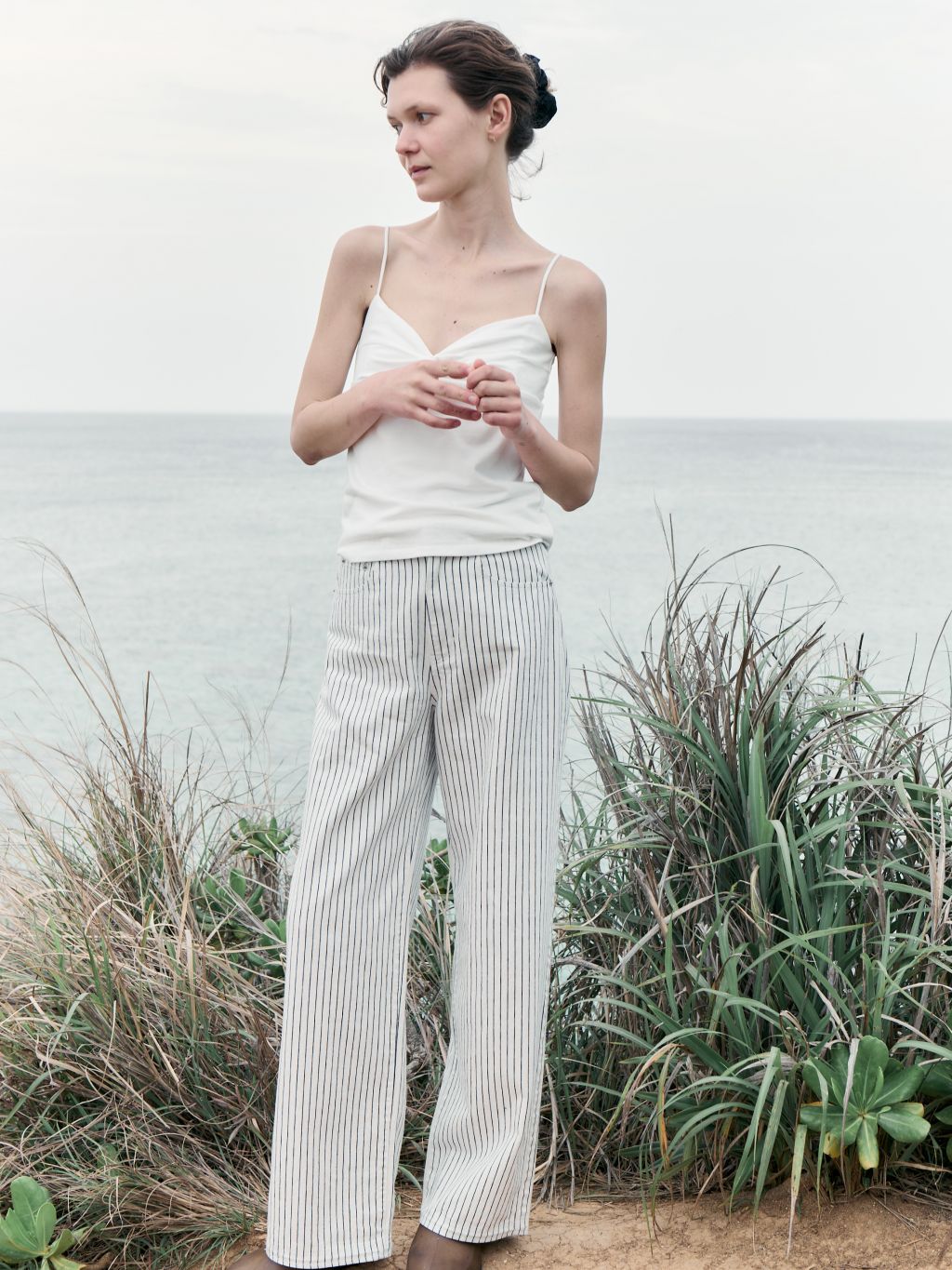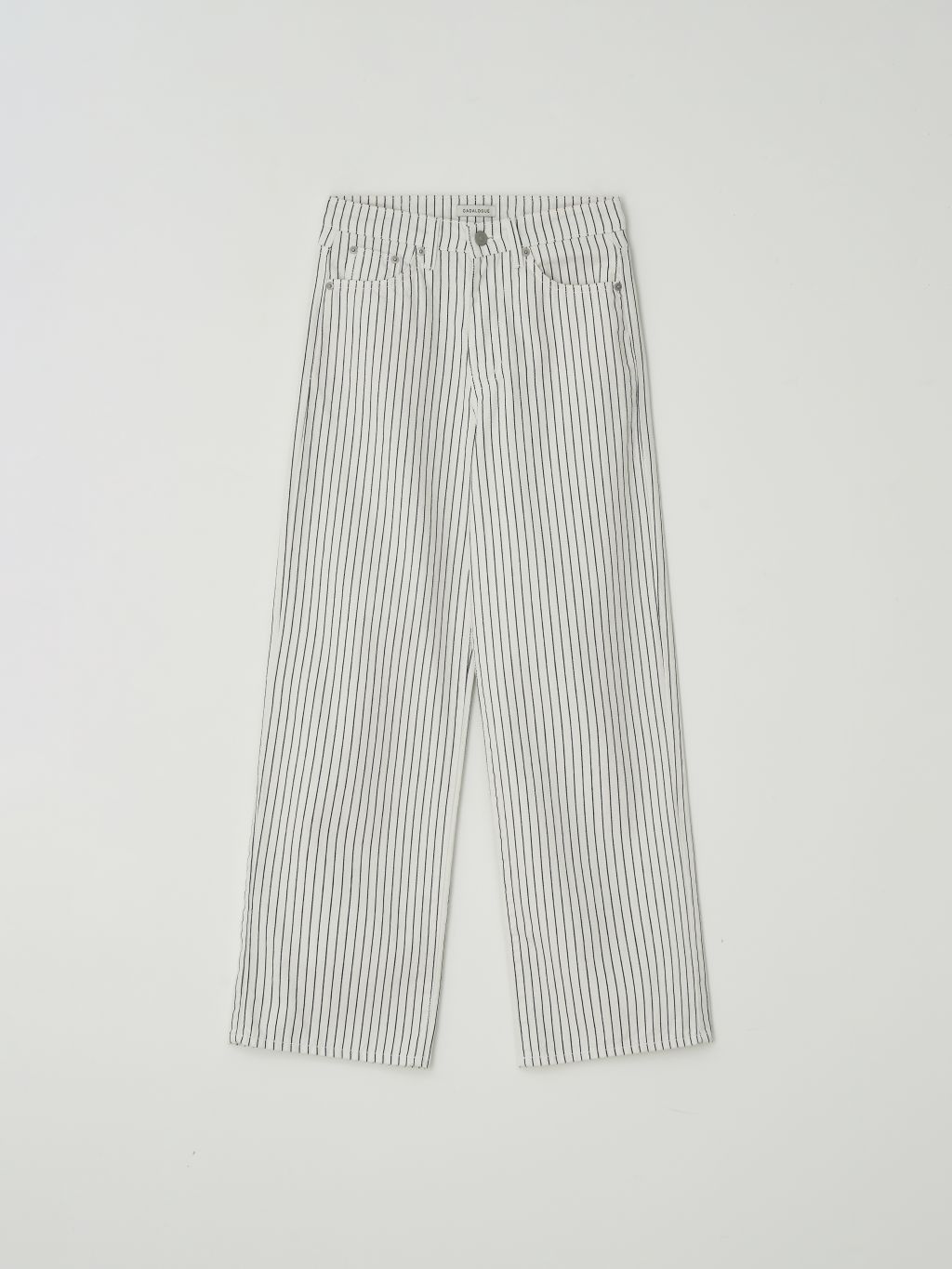 화이트와 네이비의 핀스트라이프 원단을 사용해 한층 경쾌하고 시원한 이미지를 더했습니다. 시각적으로 다리가 길어 보이는 효과와 함께, 여름 시즌에 어울리는 산뜻한 분위기를 연출할 수 있습니다.