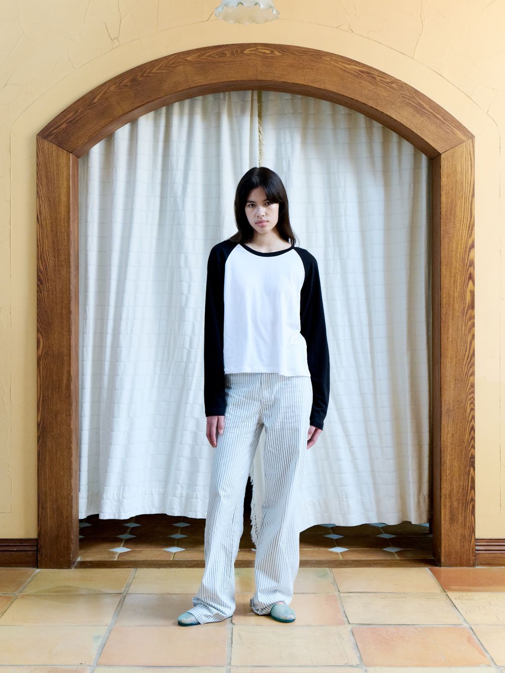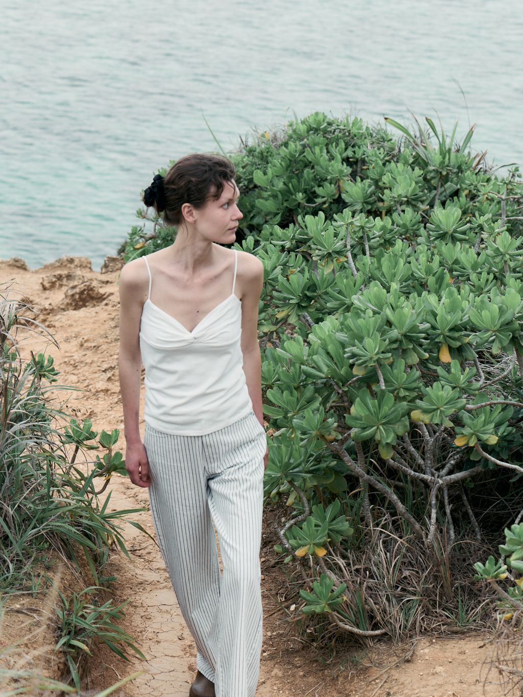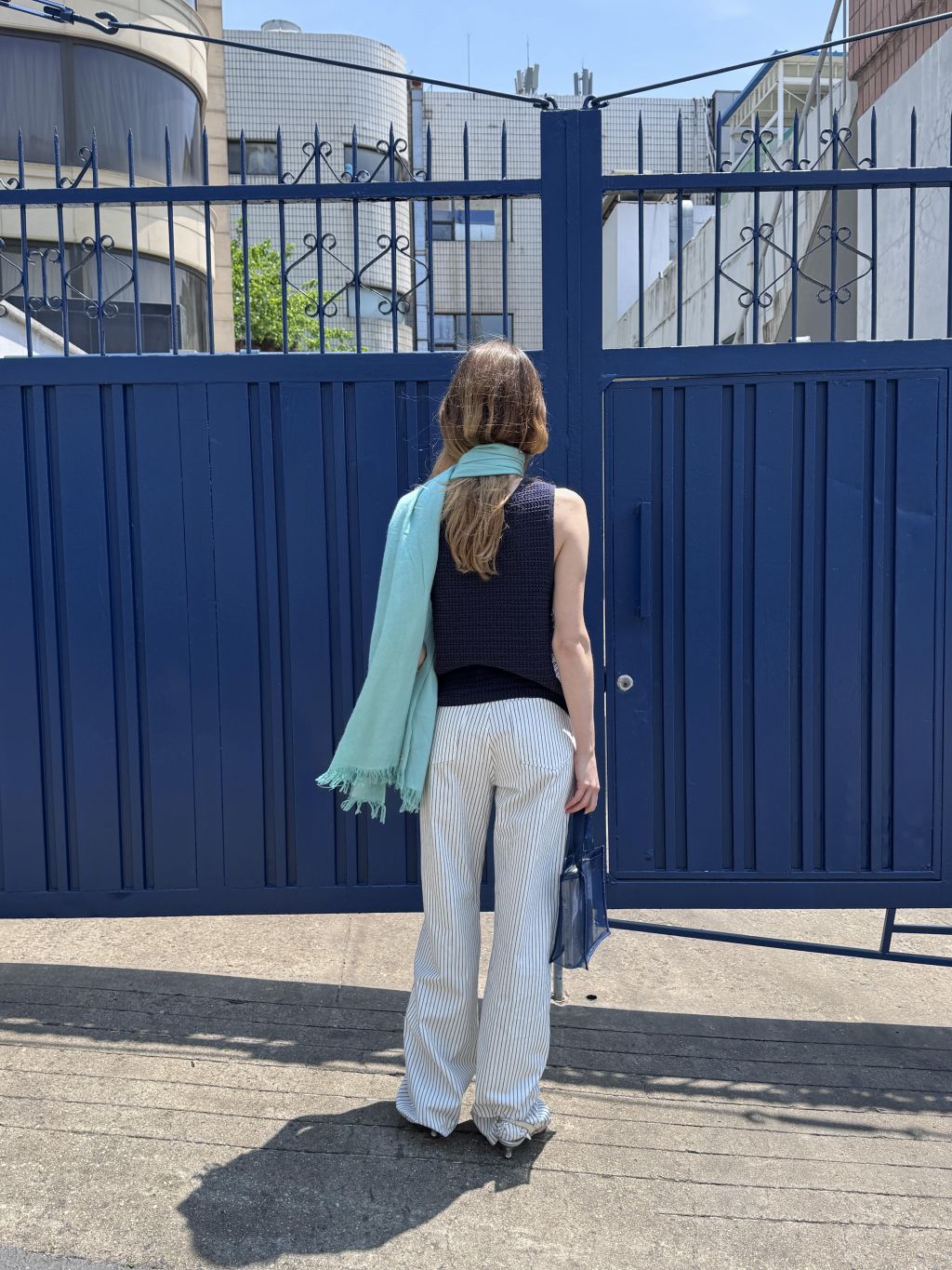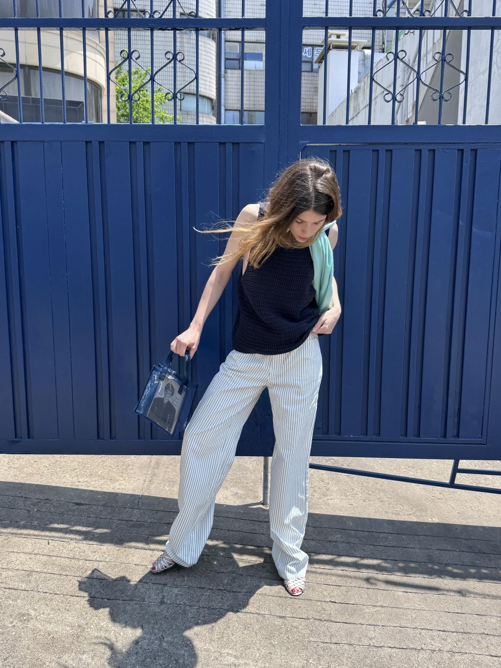 화이트와 네이비의 핀스트라이프 원단을 사용해 한층 경쾌하고 시원한 이미지를 더했습니다. 시각적으로 다리가 길어 보이는 효과와 함께, 여름 시즌에 어울리는 산뜻한 분위기를 연출할 수 있습니다.